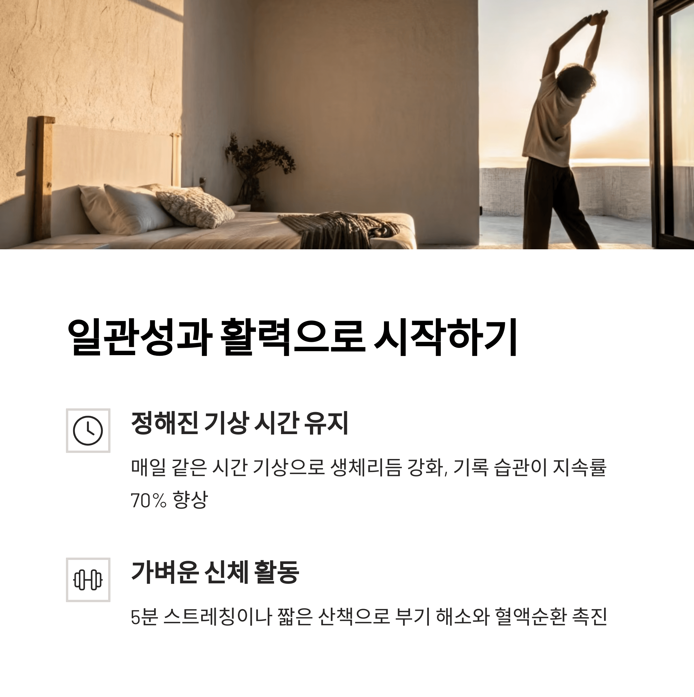 기상 후 10분 이내 스트레칭, 산책, 요가 등 간단한 활동을 추천합니다.
