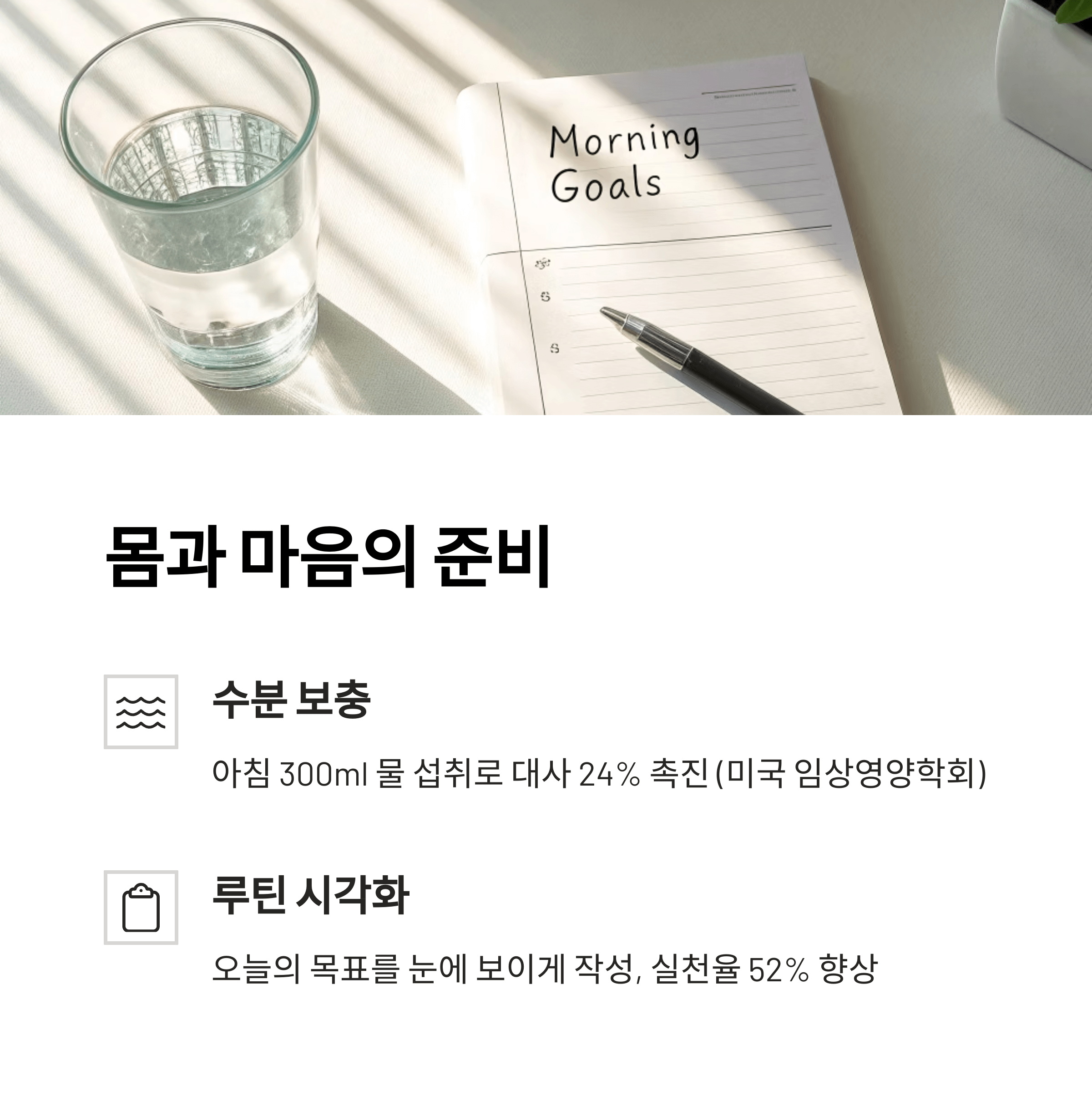 기상 직후 물 한 컵(약 200ml)은 뇌 기능과 신진대사 회복에 필수입니다.